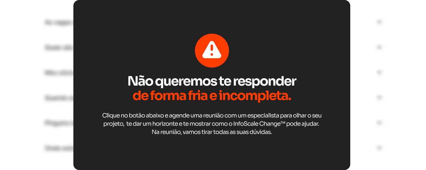 Clique no botão abaixo e agende uma reunião com um especialista para olhar o seu projeto, te dar um horizonte e te mostrar como o InfoScale Change™ pode ajudar. Na reunião, vamos tirar todas as suas dúvidas.