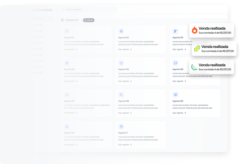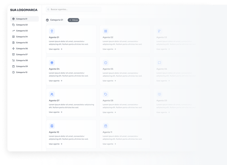Com os agentes pré-validados diretamente pelas plataformas de IA, você vai organizar tudo em um Hub claro, bonito e prático.